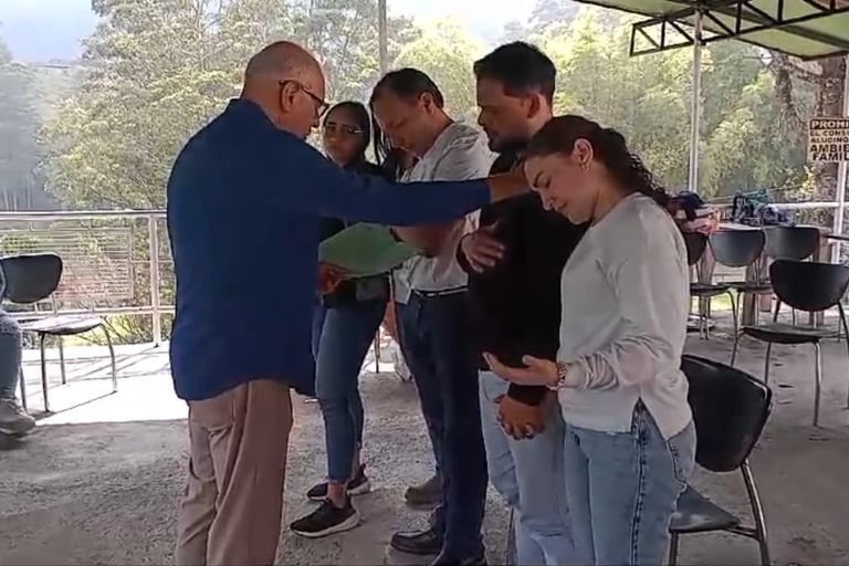 Finalmente, en 2025, Manuel viajó a Medellín, Colombia, para recibir oficialmente sus credenciales pastorales. La ceremonia se llevó a cabo en una fría y lluviosa mañana de domingo, bajo un kiosco sin paredes, rodeado por la majestuosidad de la Cordillera Central de los Andes. La escena parecía salida de un salmo, con el canto de las aves como fondo y la lluvia cayendo suavemente, como una señal de bendición divina.